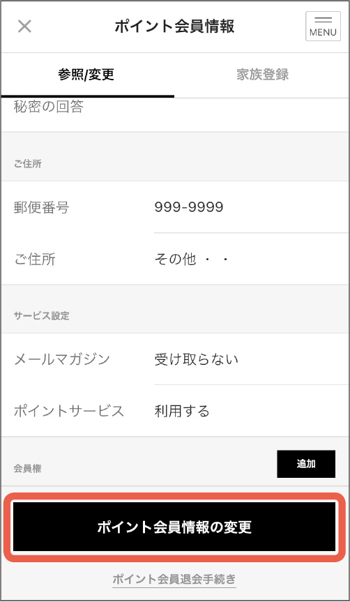 ご登録されている情報が表示されます。もしご登録内容を変更される場合は、下にある「ポイント会員情報の変更」をタップしてください。