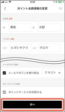 「ポイント会員情報の変更」画面が表示されますので、変更される箇所をタップしていただき、変更内容をご入力ください。変更が終了しましたら、「次へ」をタップしてください。