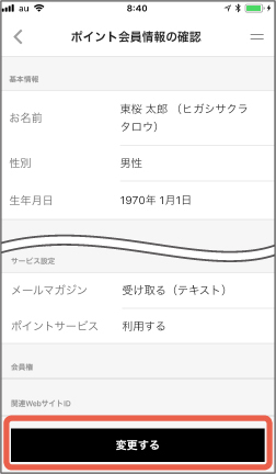 「ポイント会員情報の確認」画面になりますので、変更されたご登録内容をご確認いただきまして、お間違いなければ「変更する」をタップしてください。