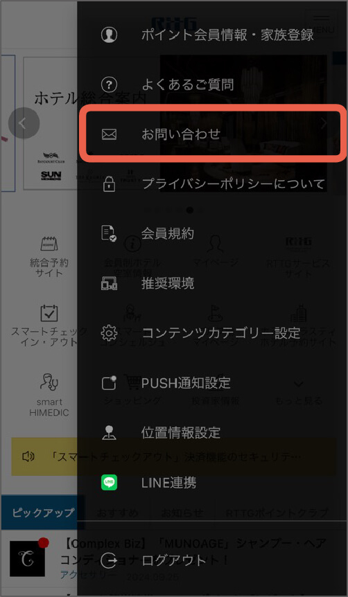 いくつか出るメニューのうち、「お問い合わせ」をタップしてください。