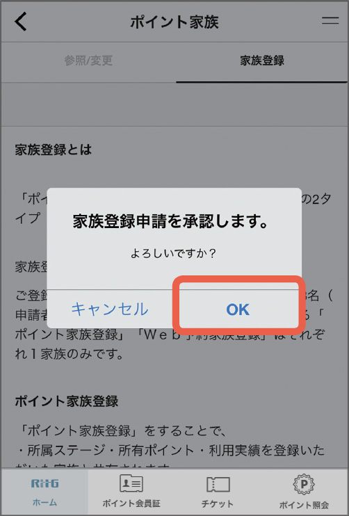 「家族登録申請を承認します。」と表示されますので、「OK」をタップすると、手続きは完了です。
