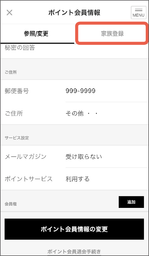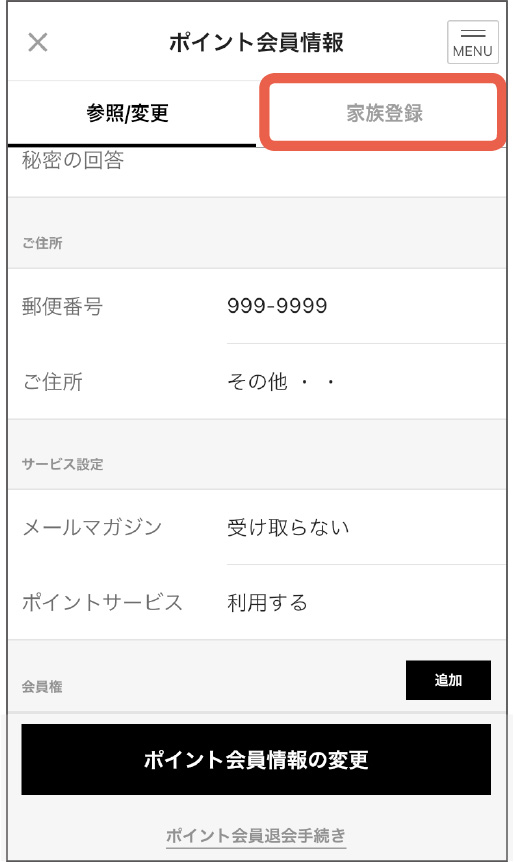 ポイント会員情報ページより、グレーの文字で記載されている「家族登録」をタップしてください。
