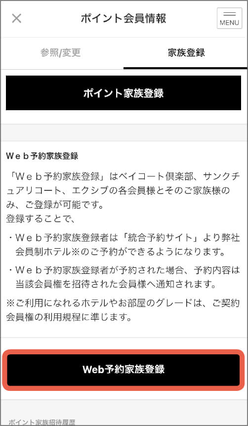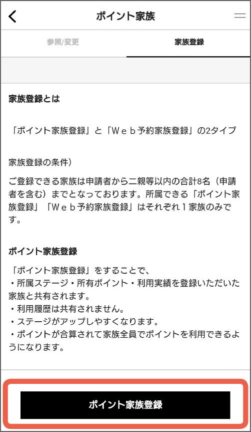 「家族登録」メニューを選ぶと「ポイント家族登録」と「Web予約家族登録」の2つの家族登録ボタンがありますので、「ポイント家族登録」をタップしてください。