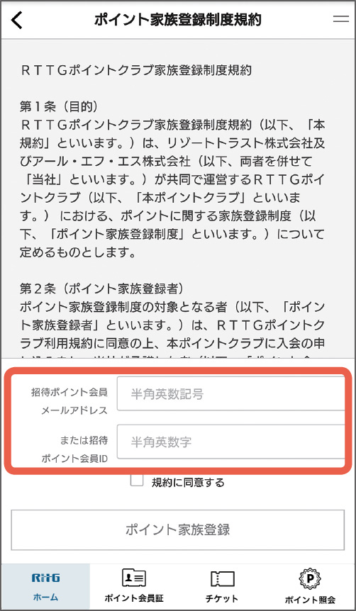 「ポイント家族登録制度規約」が表示されますので、お読みいただきまして「規約に同意する」にチェックを入れて、招待するポイント会員の「メールアドレス」または「ポイント会員ID」を入力して、「ポイント家族規約に同意して招待」をタップしてください。