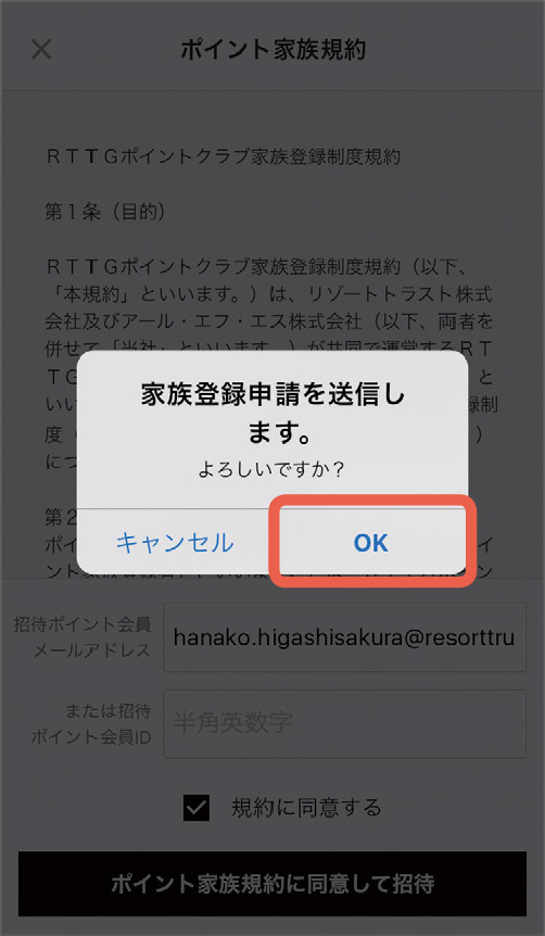 「家族登録申請を送信します」と表示されますので、「OK」をタップしてください。