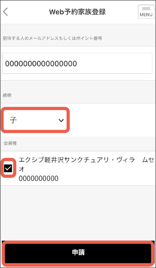 Web予約家族登録を希望されるご家族の「続柄」を選択し、「ご家族も利用できる会員権」にチェックを入れ、「申請」をタップしてください。