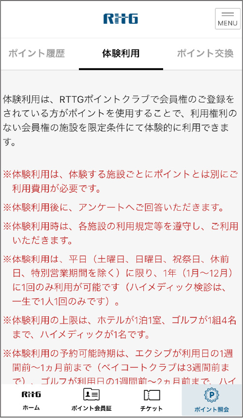 体験利用したいメニューを選んでタップすると、その体験利用メニューの詳細が表示されます。体験利用の条件や注意事項など必ずご確認ください。
