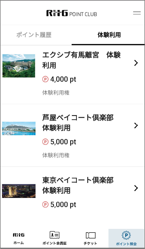 「ポイント履歴」と「体験利用」のタブが表示されますので、「体験利用」をタップすると体験利用が可能なメニューが表示されます。体験利用したいメニューを選んでタップしてください。