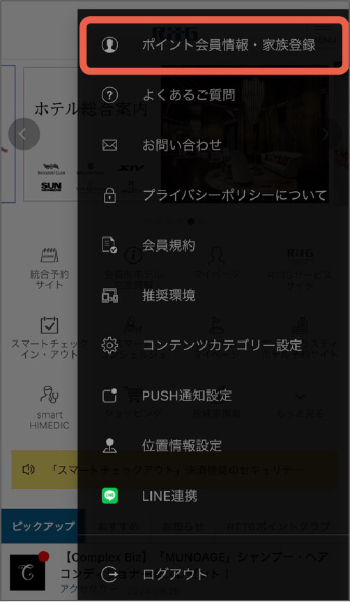 メニューが表示されますので、「ポイント会員情報・家族登録」をタップしてください。