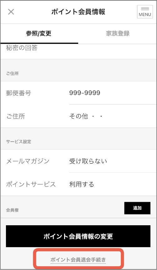 ご登録されている情報が表示されます。退会される場合は、一番下まで進んで「ポイント会員退会手続き」をタップしてください。
