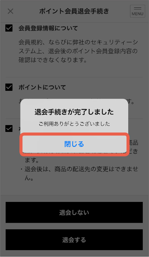 これで退会手続きは完了です。「閉じる」をタップしてください。